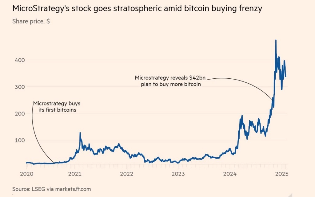 Americká softwarová společnost Strategy vedená Michaelem Saylorem zahájila rozsáhlou akumulaci bitcoinů v roce 2020 a od té doby udělala z největší kryptoměny své primární firemní rezervní aktivum. Výsledkem strategie je, že Strategy nejenže drží největší firemní bitcoinovou zásobu na světě, ale že její akcie překonaly výkonnost samotného bitcoinu.