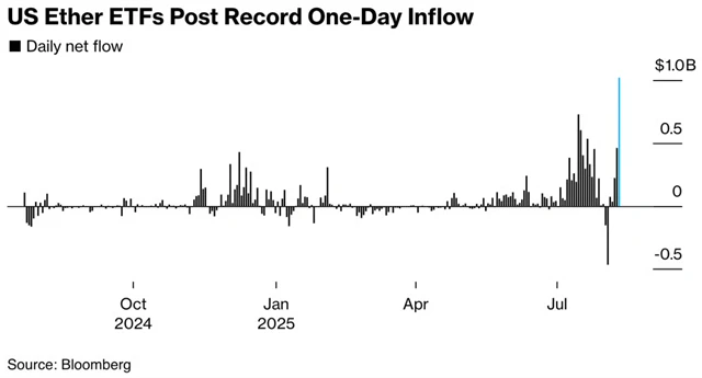 - Během léta podstatně narostl zájem o nákup etheru ze strany spotových ETF v USA. V pondělí 11. srpna dosáhl čistý příliv peněz do těchto fondů poprvé v historii miliardy dolarů za den.