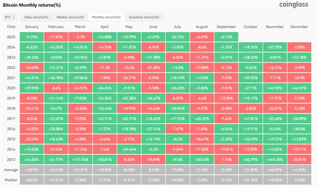 Pokud je bitcoin v letošním roce nudnější než kdy dříve, jeden faktor zůstává neměnný. Jde o sezónnost. Historická data ukazují, že září je pro virtuální měnu nejhorším měsícem v roce. Podle statistik CoinGlass průměrná zářijová výkonnost bitcoinu od roku 2013 dosahuje -3,42 %. Nejhůře dopadl v roce 2014, kdy během září odepsal přes 19 %.
