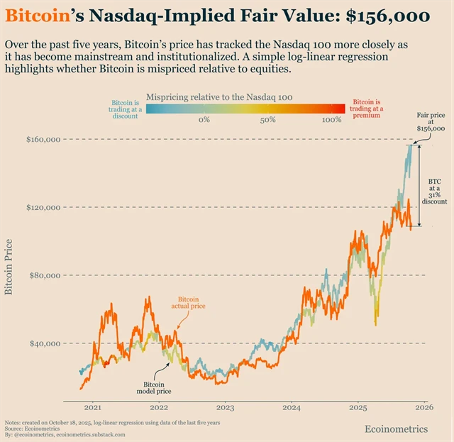Bitcoin se obchoduje zhruba 31 % pod úrovní, na které by jeho cena teoreticky "měla" být na základě dlouhodobé korelace s akciovým indexem Nasdaq-100. Tato korelace zesílila po pandemii covidu-19 a po spuštění různých burzovně obchodovaných produktů navázaných na bitcoin a jeho cenu. Trh s bitcoinem se tak do značné míry chová podobně tomu akciovému v USA. A zatímco ceny akcií jsou na nových rekordech, bitcoin se z říjnového výplachu ještě nevzpamatoval. Jeho cena implikovaná zmíněnou dlouhodobou korelací je okolo 156 000 USD.