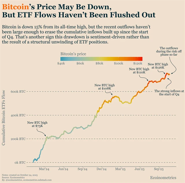 Krátkodobé výkyvy ceny jsou tak podle všeho dané posuny v sentimentu a technickými faktory, jako jsou třeba likvidace určitých pozic na derivátovém trhu. Dlouhodobý trend zůstává růstový. Struktura institucionální poptávky, měřená především toky peněz v bitcoinových ETF, v současnosti ukazuje, že i přes pokles ceny o zhruba 15 % z historického maxima instituce své pozice víceméně drží. Odlivy kapitálu byly v říjnu minimální. Dokud nenastanou výrazné několikatýdenní odlivy peněz ze zmíněných ETF, není důvod výkyvy kurzu chápat jako začátek nějaké širší medvědí fáze na trhu s kryptoměnou.