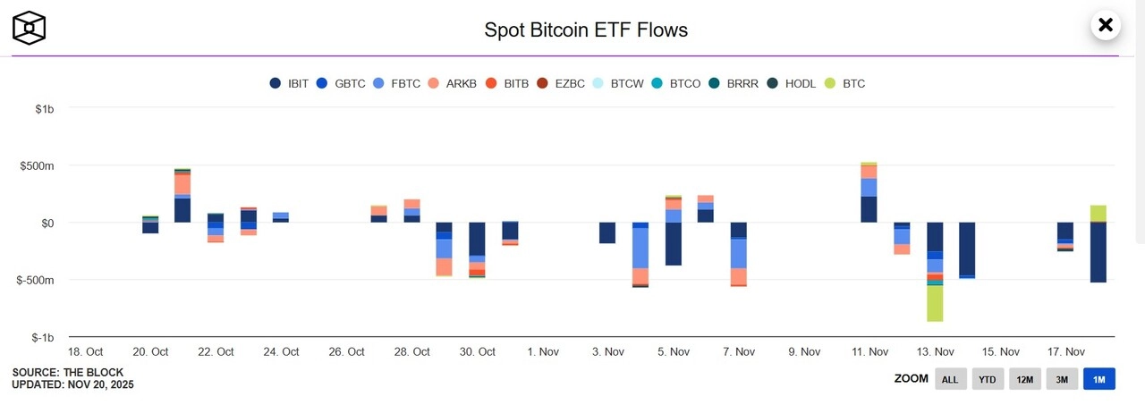 Největší pokles zasáhl iShares Bitcoin Trust (IBIT) od BlackRocku. Za jediný den z něj odteklo 523 milionů dolarů, nejvíce od jeho uvedení na trh v lednu 2024. Za celý měsíc, který navíc ještě neskončil, to bylo přibližně 2,1 miliardy dolarů. Na celkovém objemu peněz, které z trhu "zmizely", se tak podílí zhruba 70 %.