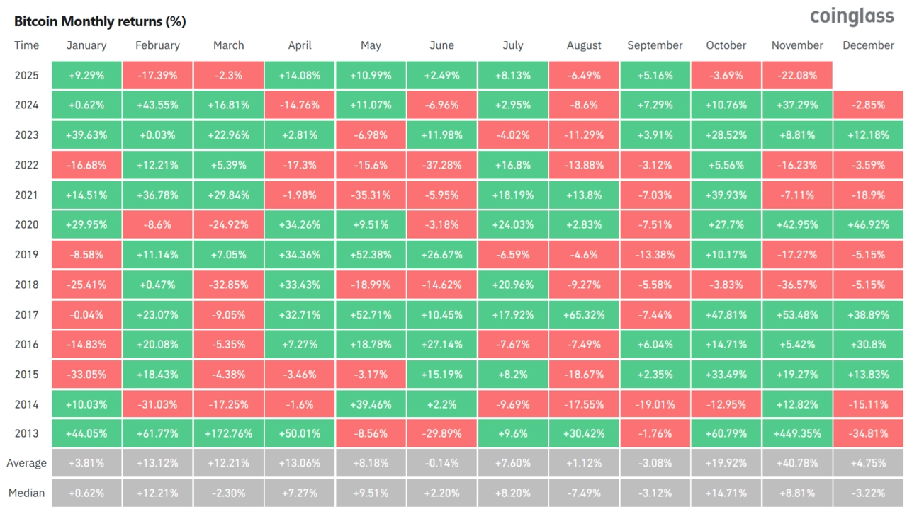 Odliv peněz z ETF a cenová korekce (z technického hlediska už s přehledem medvědí trend) největší světové kryptoměny navíc přicházejí v měsíci, kdy řada investorů historicky očekávala růst. Listopad je podle dat CoinGlass dlouhodobě pro bitcoin nejsilnějším měsícem, průměrné zhodnocení během něj přesahuje 41 %. Letos v něm oslabuje zhruba o 22 %.