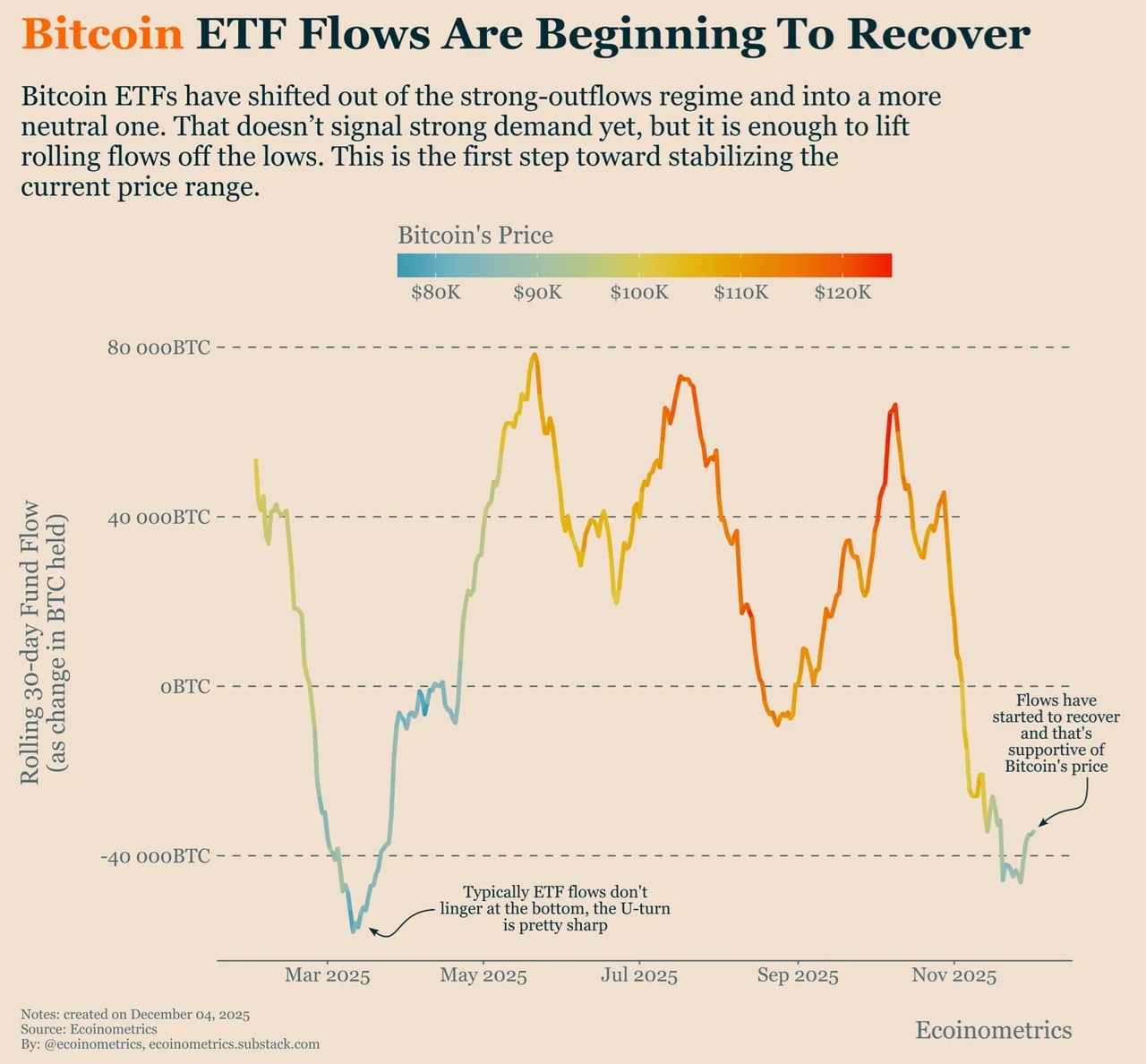 K tomu, aby vznikl signál, že cena už našla podporu, je potřeba, aby 30denní toky v rámci ETF minimálně zabrzdily pokles. Odliv peněz nemusí hned přejít v čisté nákupy, musí ale přinejmenším přestat zrychlovat.