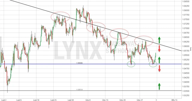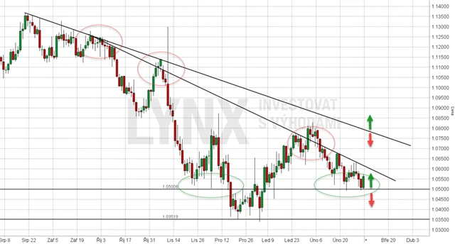 Z krátkodobého hlediska je směrodatné, kterou linii trh sebevědomě prorazí, a to následně určí, zda bude testována spodní hladina širšího rozpětí okolo 1,0350, nebo naopak hlavní horní klesající linie okolo 1,0750.