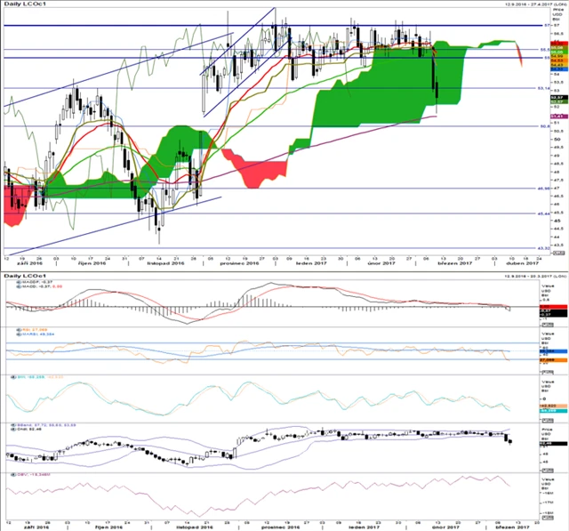 spodní linií Ichimoku mraku (podpora na 52,15). MACD shora proťala svoji signální linii a klesá. Také SMI se spustil dolů. RSI se ale již nachází v pásmu přeprodanosti, což může v souvislosti s úspěšným odražením od 200denního průměru indikovat, že by již ropa neměla zlevňovat. Technická analýza naznačuje, že ropa našla (alespoň prozatím) své dno. Otázkou je, zda se dokáže vrátit zpět nad 55 USD za barel. Podle Ichimoku mraku se totiž na této úrovni začíná tvořit slabá rezistence.