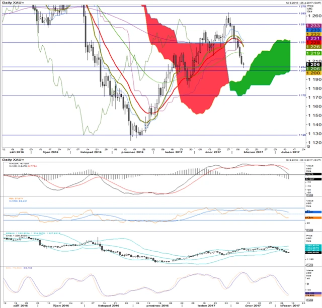 Cena zlata od minulého týdne poklesla o více než 40 USD za trojskou unci, dokázala se ale odrazit od podpory na 1 204, která je však poměrně málo testovaná. Další podpora se nicméně nachází v její těsné blízkosti na 1 200. Zlato má tedy dvojí jištění. MACD shora překřížila svoji signální linii a klesá. Naopak indikátory RSI a SMI po strmém poklesu zahájily pohyb stranou. Zlato se stále drží při spodní hranici Bollingerova pásma. Technická analýza naznačuje, že zlato má již jen omezený prostor pro pokles, a spíše proto očekáváme mírnou korekci výše.