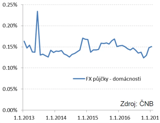 České domácnosti se podle všeho do podobných dobrodružství ani nesnaží pouštět. Podíl objemu cizoměnových úvěrů domácnostem na jejich celkových úvěrech sice v posledních měsících roste, nicméně jde možná jen o obvyklé kolísání tohoto ukazatele; koncem ledna 2017 byl teprve na úrovni, na které se nacházel již v polovině roku 2016. A i kdyby tento nárůst byl projevem spekulativních snah domácností, soudě podle výše tohoto podílu (0,15 %) jde o snahy velice vlažné. Data za únor budou k dispozici v pátek 31. března.
