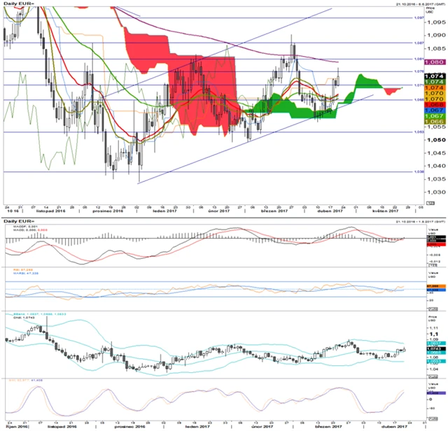 Měnový pár EUR/USD překonal své klouzavé průměry a výrazně posílil. Nejbližší podpora je na 1,071 a rezistence na 1,076. MACD se dostala nad signální linii a roste. RSI prorazil klouzavý průměr i 50bodovou linii. Také SMI roste. Vývoj páru bude do značné míry ovlivněn výsledkem francouzských prezidentských voleb. Technická analýza naznačuje, že trhy spíše sázejí na vítězství umírněných proevropsky orientovaných kandidátů a na posilování eura.