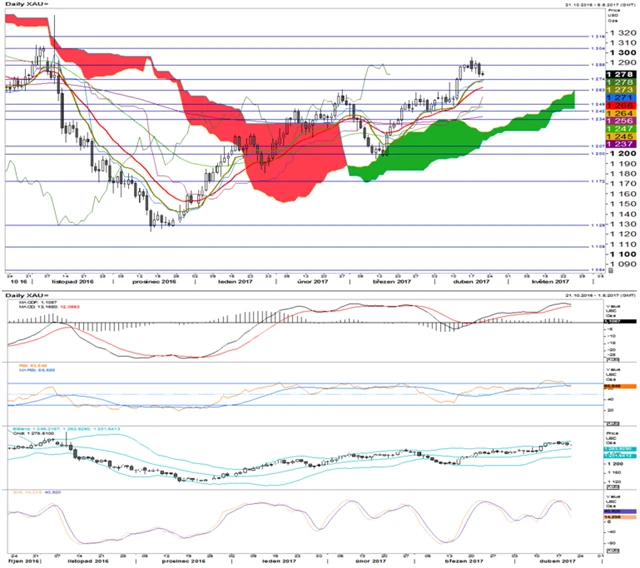 Cena zlata se po většinu uplynulého týdne pohybovala do strany a aktuálně kolísá nad podporou na 1 274. MACD je jako na houpačce a opět se chystá shora překřížit svoji signální linii. RSI vystoupil z pásma překoupenosti a poklesl pod svůj klouzavý průměr. Rovněž SMI zamířil dolů. Zlato mírně zakolísalo ve světle slabé poptávky po mincích v USA. Blížící se francouzské prezidentské volby by ale měly cenu udržet nad klouzavými průměry. Nedělní výsledek 1. kola voleb může mít výrazný dopad na investiční sentiment. Technická analýza indikuje vítězství umírněnějších kandidátů a pokles ceny zlata.