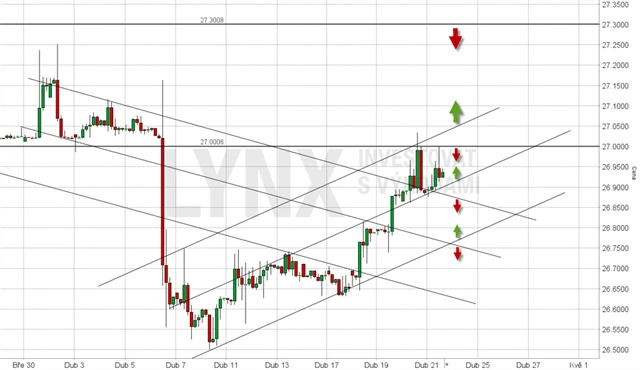 Nyní se postup zastavil u 27 EUR/CZK. To je až příliš očividná hladina, dal by se tedy očekávat i pohyb k 27,3. Na této úrovni se bude nacházet spousta nákupních stop příkazů. Po jejich vyplnění by se momentum mohlo zastavit, pokoří-li tedy kurz nejprve hladinu 27 EUR/CZK. V opačném případě by pár mohl sestoupit směrem k cenám 26,5 a následně 26 a 25. Celá čísla a poloviční korunové hodnoty budou důležitými hladinami v obou směrech.