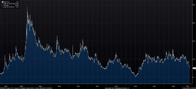 Volatilita klesá i na měnovém trhu. A nemůže za to zrovna česká koruna. Index započítané volatility na hlavních měnových trzích (VXY) klesá po vzedmutí na vlně Trump efektu na úrovně z první poloviny roku 2014. V poklesu kolísavosti je na čele měnový pár EUR/USD, který se převalil z úzkého pásma 1,10-1,05 během většiny loňského roku do pásma 1,05-1,10 v posledním půlroce.