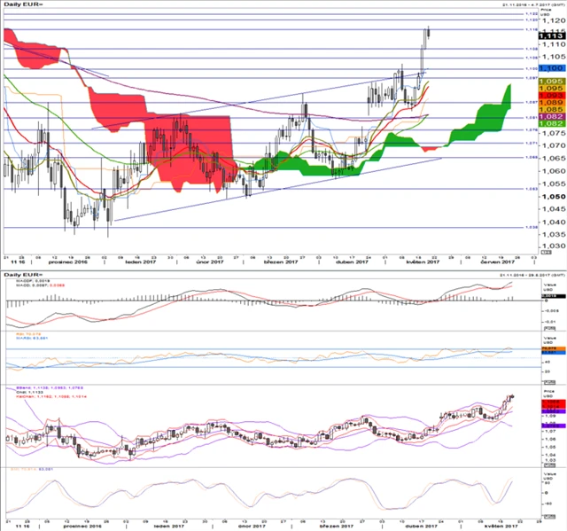 Technická analýza měnového páru EUR/USD a cen ropy Brent a zlata. (19. 5. 2017)