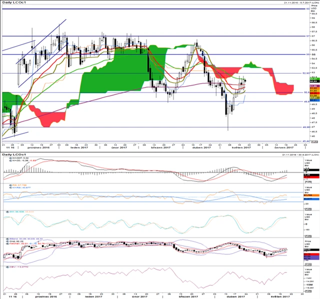 Ropa v uplynulých 14 dnech postupně umazávala ztráty. Aktuálně se zastavila pod 50denním průměrem, který funguje jako rezistence. Další hladiny odporu jsou na 52,9 a 53,58 (Ichimoku mrak). MACD pokračuje v růstu. RSI a SMI se pohybují do strany a nevysílají jasný signál, stále ale mají prostor na další růst. Keltnerův kanál zůstává uvnitř Bollingerova pásma a ani OBV nepredikuje změnu. Technické indikátory vyznívají neutrálně. I tak očekáváme, že se cena pokusí zaútočit na rezistence a pokračovat v korekci poklesů.