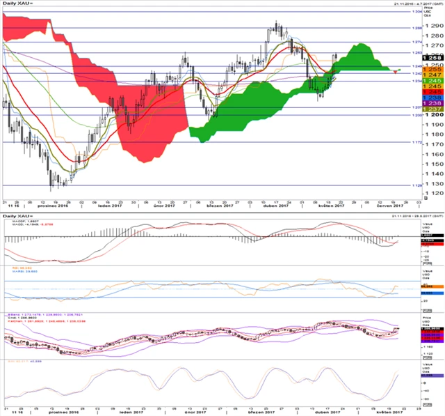 Oslabující americký dolar a politické vrtochy Donalda Trumpa vedly k opětovnému útěku investorů do bezpečí zlata, jehož cena se tak dostala nad své klouzavé průměry. Jako významná se v minulých dnech ukázala spodní hranice Ichimoku mraku, kterou cena dokonale kopírovala. MACD a SMI zamířily nahoru, RSI zastavil růst. Keltnerův kanál ani Bollingerovo pásmo nenaznačují změnu trendu. Zlato opět potvrdilo pověst bezpečného přístavu, nedomníváme se ale, že by bez dalšího stimulu v podobě zvýšené nejistoty bylo schopno překonat rezistenci na 1 263. Doporučujeme věnovat zvýšenou pozornost politickému dění v USA.
