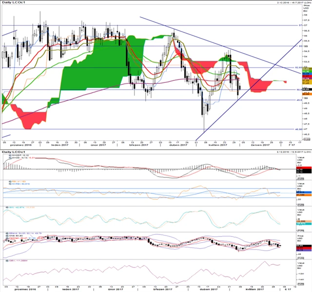 Technická analýza měnového páru EUR/USD a cen ropy Brent a zlata. (2. 6. 2017)