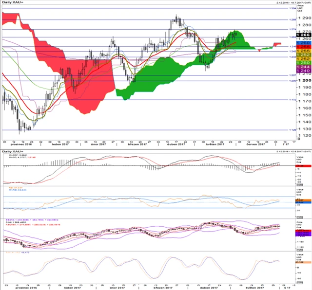 Ichimoku mrak se v posledních týdnech ukazuje jako nejlepší přítel investorů. Rezistence na 1 263 sice chvíli odolávala, zlato se ale postupně vyšplhalo až na 1 274. MACD setrvává nad signální linií, vzdálenost histogramu od nuly je ale de facto neměnná. Rovněž SMI a RSI neukazují na žádný zřejmý trend. MACD, RSI ani SMI tedy nevysílají jasný signál, Ichimoku mrak ale predikuje postupný návrat pod 1 263.