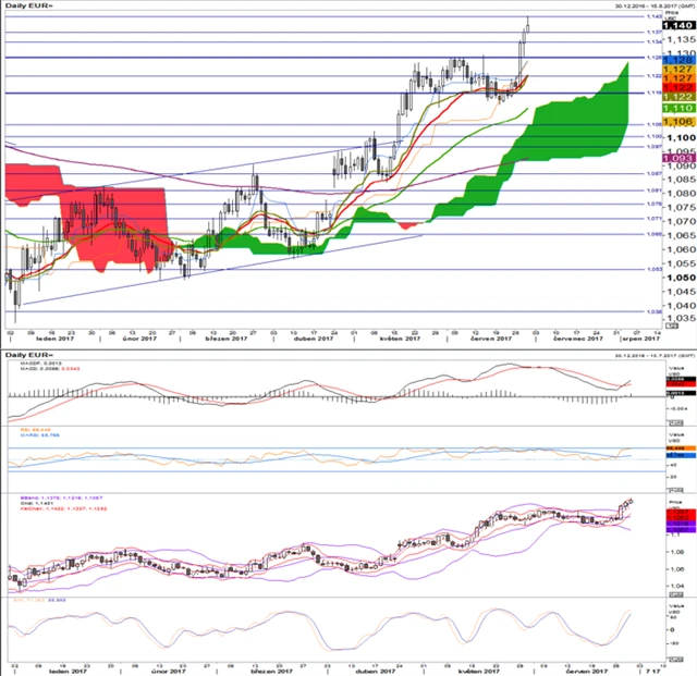 Náznak blížícího se taperingu ze strany ECB poslal euro na malou rally. Historické rezistence působily jako dobré indikátory toho, kde eurodolar na konci obchodování uzavře. MACD začala opět růst, RSI se zastavil těsně pod svojí hranicí překoupenosti a SMI je již také poměrně vysoko. Technické indikátory ukazují, že eurodolar má jen omezený prostor k dalšímu růstu. Další rezistence je na 1,147. Někteří investoři mohou vysokých hodnot využít k vybírání zisků.