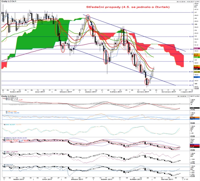 Cena ropy se vrátila do svého trendového kanálu, ale díky oslabujícímu dolaru a nižší americké produkci dokázala vyšplhat i nad své 20denní klouzavé průměry. Aktuálně se zastavila o spodní hranici Ichimoku mraku na 47,78. Všechny sledované indikátory ukazují na býčí náladu. MACD se dostala nad svoji signální linii, RSI nad svůj klouzavý průměr i 50bodovou linii a také SMI míří nahoru. Indikátory již nenaznačují, že je ropa přeprodaná. Cena míří výše, ale může se jednat pouze o korekci v rámci sestupného trendu, ne o změnu trendu samotného. V prvním případě vidíme maximum korekce okolo 51. Trhy jsou ale velice opatrné a bez dalších pozitivních zpráv se 51 USD za barel ukáže jako nerealistická hodnota. Růst nad tuto hodnotu by byl silným indikátorem změny trendu.