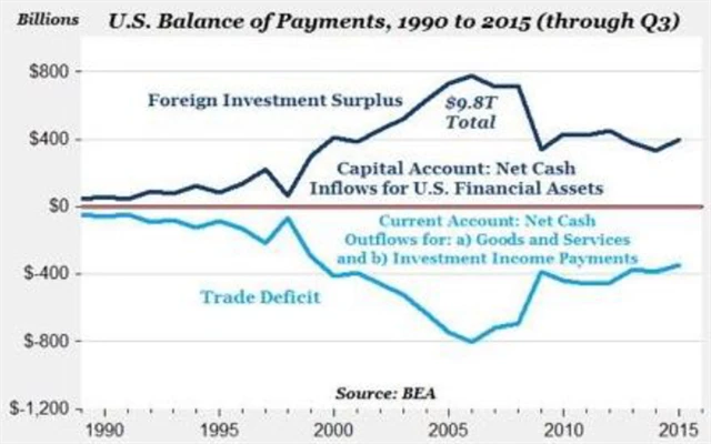 Jenže zrovna u dolaru nemusí popsaná logika (deficit běžného účtu bude tlačit na oslabení) platit ani v řádu let. Díky atraktivitě americké měny jako měny rezervní, tedy díky přebytku v části platební bilance USA pokrývající obchod s cennými papíry, žijí Američané s deficitem běžného účtu léta, jako kdyby se nechumelilo. Zrcadlení běžného a finančního (v USA říkají často ještě postaru kapitálového) účtu je dobře patrné minimálně od 90. let.