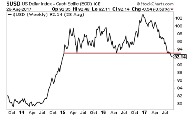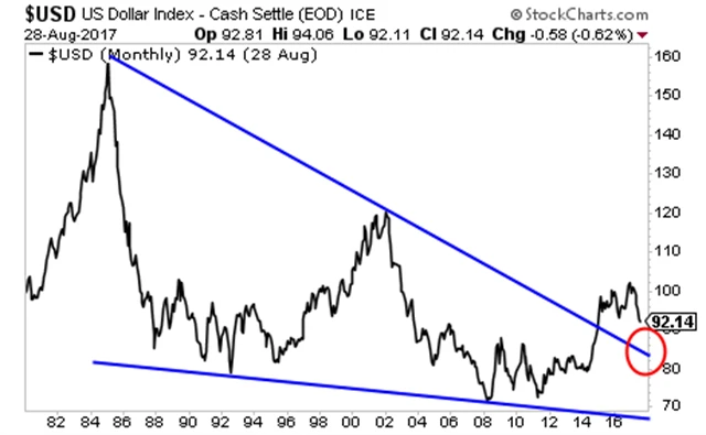 Od začátku 80. let index amerického dolaru (se všemi kolísáními) postupuje spíše níže. Nedávno mohl z tohoto "trendu" vystoupit (hovořit o trendu v tak dlouhodobém horizontu není úplně košer), ale hladinu 120 bodů nezdolal. Nyní opět klesá a může se vrátit až k horní linii pásma, které rámuje jeho vývoj v posledních desetiletích.