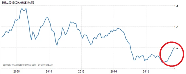 Silné euro lze číst jako slabý dolar. Nastalo totiž vystřízlivění po počátečním optimismu ze zvolení Donalda Trumpa prezidentem USA. Kombinace velkých daňových škrtů s výrazným fiskálním stimulem, která by tlačila úrokové sazby vzhůru, může mít v Kongresu problém se schválením. Dolar tak od března oslabil vůči širokému obchodně váženému měnovému koši o zhruba 7 %.
