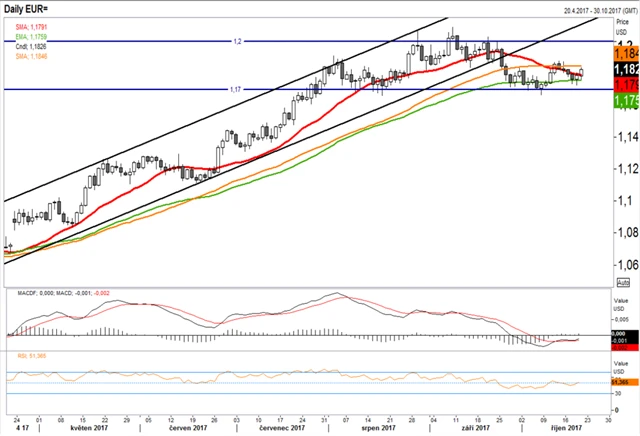 V současnosti je cenový kanál horizontální mezi 1,17 a 1,2. Kurz osciluje ve spodní části kanálu, technické indikátory ale naznačují, že se v něm drží poměrně stabilně. RSI je na neutrální úrovni, MACD se blíží nulovým hodnotám. V minulém týdnu se kurz odrazil od exponenciálního klouzavého průměru, který funguje jako téměř horizontální supportní linie na úrovni 1,175. Jako linie rezistence by mohl fungovat 50denní průměr, tyto signály jsou ale prozatím poměrně slabé.