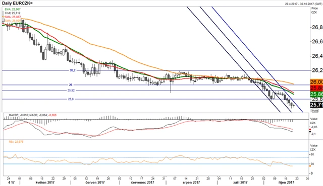 Od června do konce září se kurz EUR/CZK držel v horizontálním cenovém kanálu mezi 26 a 26,2. Ke konci září byl support na 26 proražen a koruna začala posilovat a pokračuje v tom (po krátké pauze ve druhém říjnovém týdnu) dosud. Koruna minulý týden posílila na 25,7 a kurz se propadl hluboko pod klouzavé průměry. RSI potvrzuje silnou tendenci k poklesu, fundamentálně ale očekáváme stabilizaci. Posílení totiž silně souvisí s očekáváními na úrovni měnové politiky. Pokud nepřijdou nové zprávy, efekt změny politiky se pravděpodobně vyčerpá.