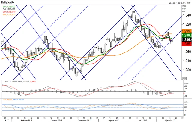 Cena zlata je letos velice cyklická. Prudký růstový kanál střídá silný pokles. Růsty i poklesy probíhaly víceméně stejnou rychlostí (kanály byly zhruba rovnoběžné). Mezi koncem srpna a začátkem října probíhala opět strmě sestupná fáze, v prvním říjnovém týdnu došlo k jejímu prolomení a obratu v růst. V současnosti ale hrozí, že cena růstový kanál opustí na spodní straně. Prolomení bývala v minulosti vždy doprovázeno silným překoupením (podle RSI), to ale nyní nevidíme. Signály tedy postrádají sílu. Nelze vyloučit, že cena zlata poruší svůj silně cyklický vývoj, nelze ale vyloučit ani potvrzení růstové trajektorie.