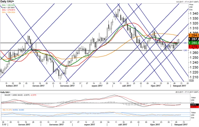 Cena zlata měla v letošním roce silný cyklus, kdy prudký růstový kanál střídal silný pokles. Růsty i poklesy probíhaly víceméně stejnou rychlostí (kanály měly stejnou směrnici). V průběhu října byl cyklus výrazně narušen, dalo se hovořit o zvýšení frekvence. Na přelomu října ale před růstovou fází nastala stagnace charakterizovaná horizontálním cenovým kanálem 1 265 až 1 280. Cena v prvním listopadovém týdnu prolomila hranici 1 280. Pokud trend udrží, může se opět dostat do růstové fáze naznačené rostoucím cenovým kanálem. Na stejné úrovni jsou také 20denní klouzavé průměry. Trh tedy stojí před rozhodnutím. Mohl také vzniknout nový support na 1 280.