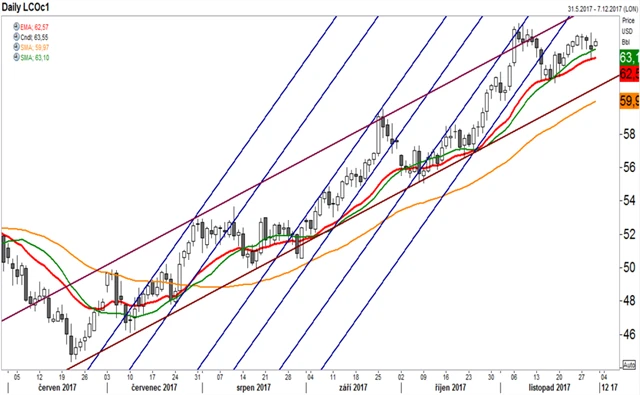 V ceně ropy se od poloviny června prolínají dva silné trendy. Prvním z nich je silný dlouhodobý růstový trend ohraničený trendovým kanálem. Projevuje se ale také další cyklus, kdy jsou strmě rostoucí kanály (se shodnou směrnicí) střídány stagnacemi či poklesy. 20denní klouzavý průměr zároveň funguje jako linie podpory. Na přelomu října a listopadu cena opět prudce vzrostla. Strmě rostoucí kanály jsou ukončovány kontaktem s horní hranicí dlouhodobého trendu. Stejný scénář se odehrál i v listopadu. Nyní je kurz opět blíže linii podpory. Technické indikátory ukazují na pozvolný růst podporovaný 20denním klouzavým průměrem, shora omezený horní hranicí dlouhodobého trendu (zhruba 67).
