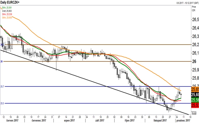 Ke konci září byla proražena hranice 26 a kurz začal klesat. To víceméně pokračovalo do druhé poloviny října. Od 20. října se kurz stabilizoval v novém horizontálním cenovém kanálu 25,5–25,7. Spodní hranice kanálu byla v listopadu krátkodobě proražena, v současnosti ale kurz vzrostl a je zpět v pásmu. Pár je shora limitován i dvouměsíčním klouzavým průměrem, který funguje jako rezistence. Na spodní straně jako support působí měsíční klouzavé průměry. EUR/CZK se v současnosti nachází uprostřed cenového kanálu (25,6). Zdá se, že bude pokračovat v horizontálním směru. Celkově očekáváme stagnaci omezovanou klouzavými průměry mezi 25,56 a 25,66.