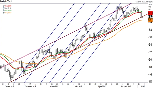 V ceně ropy se od poloviny června prolínají dva silné trendy. Prvním je silný dlouhodobý rostoucí trend ohraničený rostoucím trendovým kanálem. Projevuje se ale i další cyklus, kdy jsou strmě rostoucí kanály (se shodnou směrnicí) střídány stagnacemi či poklesy. Na přelomu října a listopadu cena opět prudce vzrostla. Strmě rostoucí kanály jsou ukončovány kontaktem s horní hranicí dlouhodobého trendu. V posledním týdnu cena výrazně poklesla a dostala se do kontaktu se spodní hranicí dlouhodobého trendu. Ta by měla zafungovat jako support a cenu odrazit výše. Technické indikátory ukazují na růst, nicméně 20denní průměr může růst zpomalovat, naopak dolní hranice dlouhodobého trendu jej bude podporovat.
