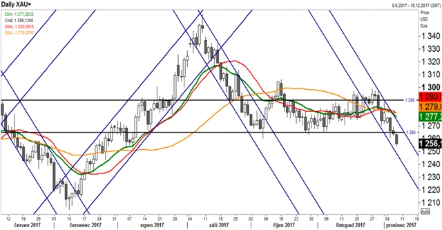 Cena zlata měla v letošním roce silný cyklus, kdy prudký růstový kanál střídal silný pokles. Růsty i poklesy probíhaly víceméně stejnou rychlostí (kanály měly stejnou směrnici). V říjnu a listopadu ale místo rostoucí fáze byla cena zlata charakterizována horizontálním cenovým kanálem 1 265 až 1 290. Minulý týden kurz opět začal rychle klesat, přičemž rychlost poklesu odpovídá cyklu ze začátku podzimu. Pokud sestup vydrží, tak se horizontální support (1 265) promění v rezistenci. Klouzavé průměry, které v listopadu fungovaly jako supporty, se změnily na rezistence a v současnosti se nacházejí v těsné blízkosti 1 280. Cena zlata bude spíše klesat než stoupat, protože je silně omezována hranicí horizontálního supportu (1 265) a následně klouzavými průměry. Navíc možná opět nabrala cyklickou dynamiku z první poloviny roku.