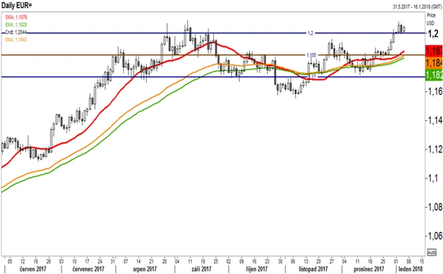 Technická analýza kurzů EUR/USD a EUR/CZK a cen ropy a zlata, jejímž autorem je analytik Vít Macháček z České spořitelny. (6. 1. 2018)