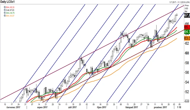 V ceně ropy se od poloviny června prolínají dva silné trendy. Prvním z nich je silný dlouhodobý růstový trend ohraničený trendovým kanálem, projevuje se ale také další cyklus, kdy jsou strmě rostoucí kanály (se shodnou směrnicí) střídány stagnacemi či poklesy. V průběhu prosince cena opět rychle rostla. Strmě rostoucí kanály jsou ukončovány kontaktem s horní hranicí dlouhodobého trendu. K tomu cena v současnosti směřuje, ale ještě jí pár dolarů chybí (zlom lze čekat na 70). Zdola je cena omezována 20denním klouzavým průměrem. Technické indikátory ukazují na další růst ceny směrem k 70 a následnou stagnaci či mírný pokles směrem ke klouzavým průměrům (při ceně 70 dolarů by šlo zhruba o hladinu 66).