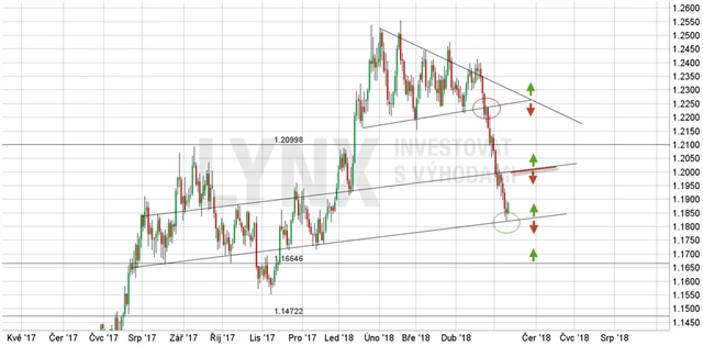 Na grafu je patrný odraz, který bude cílit pravděpodobně na vyšší rovnoběžnou linii okolo 1,2000 EUR/USD. Od té by se kurz mohl vydat opět níže. Předpoklad sestupného trendu bychom přehodnotili až v případě postupu kurzu nad 1,2300.