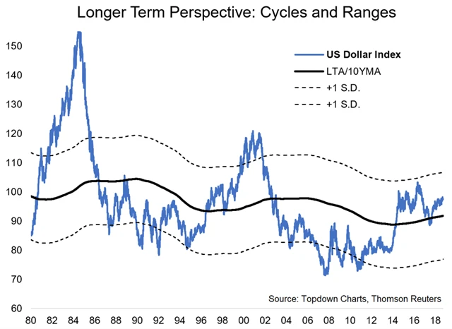 Index amerického dolaru by mohl po proražení nad dlouhodobý průměr pokračovat na vyšší úrovně, historie ale varuje před množstvím nepotvrzených náznaků podobných dlouhodobějších růstů. Vzhledem k váze eura v dolarovém indexu bude zásadní vývoj měnového páru EUR/USD.
