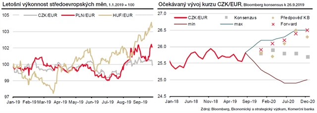 Investoři na finančních trzích vnímají vysokou závislost na stále více zpomalující německé ekonomice, respektive jejím průmyslu. A expozice Česka je v tomto směru extrémní. Vzhledem k námi předpokládanému příchodu recese do USA a dalšímu zpomalení hospodářského růstu v Evropě je naším hlavním scénářem pro rok 2020 oslabení koruny výrazněji nad hladinu 26 EUR/CZK(v grafech kurzy uvedeny chybně – pozn. red.).