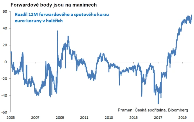 Forwardové body na trhu s eurokorunou jsou na nových maximech. Eura je možno prodávat na forward za výrazně lepší kurz než ten rozpočtovaný ve většině predikcí. Zvážit lze také zajištění FX collarem, kdy je stanoven zajištěný kurz na úrovni toho rozpočtovaného a zůstává možnost využití případného většího oslabení koruny.