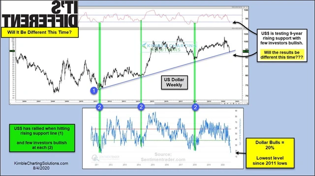 Je ale zajímavé, že dolaru aktuálně věří minimum traderů. Býčí názor na americkou měnu má aktuálně jen pětina trhu. Kdykoli přitom byl dolar v takové neoblibě a testoval zároveň zmíněnou linii podpory, zamířila jeho hodnota brzy vzhůru. Pokud by se vzorec z uplynulé dekády naplnil i tentokrát, dolar by začal posilovat (pro akcie nebo třeba zlato ne zrovna nejlepší věštba, to je ale na jiný článek).