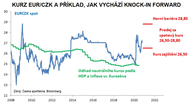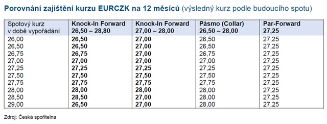 Ke zvážení je také zajištění knock-in forwardem (KIF), které poskytuje bližší zajišťovací kurz anebo širší možnost prodávat za lepší spotový kurz při případném oslabení koruny. Například zajišťovací kurz 27,00 EUR/CZK s možností prodávat za spotový až za 28,00 EUR/CZK, nebo zajištění kurzu na 26,50 s možností prodávat za spotový až za 28,80 EUR/CZK. Lepší parametry KIF jsou vykoupeny povinností prodávat za zajišťovací kurz, oslabí-li koruna na spotu nad horní bariéru, tedy například za 27,00 EUR/CZK, bude-li spotový kurz nad 28,00. Připomeňme ale, že na zajištění přes opční strategie je potřeba být klasifikovaný investor/obchodník alespoň jako středně znalý podle regulace MiFID II.