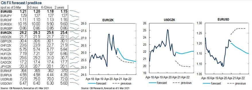 Zpřísnění měnové politiky zůstává klíčovým faktorem pro náš výhled vývoje kurzu koruny ve středně- až dlouhodobém měřítku. Krátkodobě mohou působit na kurz rychlejší oživení evropské ekonomiky oproti té české a také případné dřívější zvýšení sazeb ČNB, a dále navíc také (selhávající) očkovací program v Česku, který zvyšuje možnost podzimní epidemické vlny. Střednědobě mohou na českou ekonomiku, a tedy i měnu, působit faktory jako strukturální podpora průmyslové kapacity na straně jedné, ovšem i možné dopady rozvoje elektromobility na domácí automobilový průmysl.