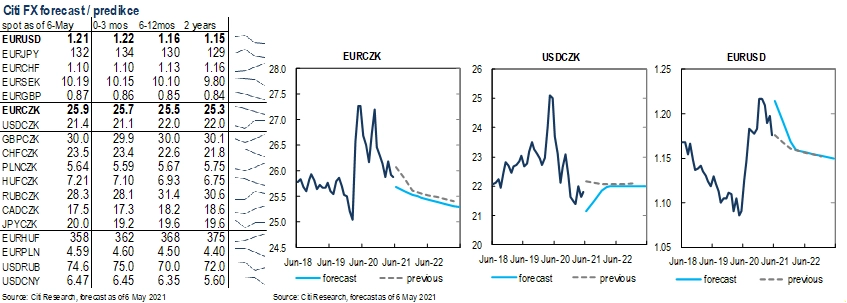 Střednědobou a dlouhodobou predikci (na rok a dva roky) ale ponecháváme bez výraznější změny, dále čekáme jen mírné posílení české měny. To by mělo být podporováno oživením ekonomiky po pandemii a zvýšením základní sazby ČNB, ale na druhé straně limitováno vyššími americkými dluhopisovými výnosy a poklesem EUR/USD.