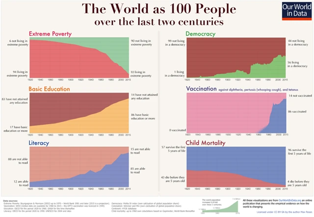 Problémem je to, že i když se hodně věcí zlepšuje, tyto změny jsou postupné, takže je v podstatě nevnímáme. Množství informací, které máme k dispozici a s nimiž většina z nás nedokáže rozumně pracovat, nám přitom často vykresluje jiný obraz o světě kolem nás, než jaký ten svět opravdu je.