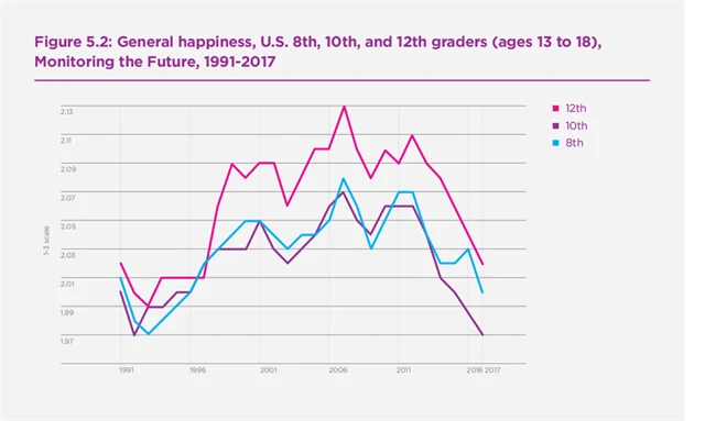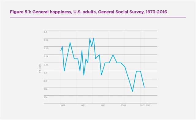 Přesto si velká část lidí myslí, že se věci mění k horšímu. Stačí se podívat na grafy ze zprávy společnosti Gallup World Happiness Report 2019. Na prvním jsou výsledky průzkumu (mezi lety 1973 a 2016 v USA) toho, jak šťastní se lidé cítí. Na první pohled je patrný silný "medvědí trend".