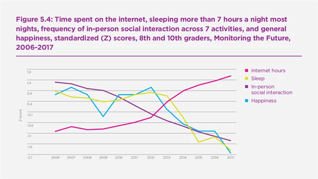 A ještě hůře vyznívá, když se podíváme na štěstí v kontextu toho, kolik lidé spí, tráví času na internetu a jsou v kontaktu s jinými lidmi (ne přes sociální sítě, naživo).