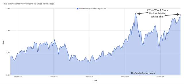 Americké akcie jsou extrémně drahé. Vyšší než dnes bylo jejich ocenění vyjádřené jako poměr tržní kapitalizace k hrubé přidané hodnotě jen jednou v historii, na konci března 2000. Jestli se tak o propadu cen akcií na začátku nového tisíciletí hovoří jako o splasknutí obří bubliny, proč je dnes bublina téměř sprosté slovo?