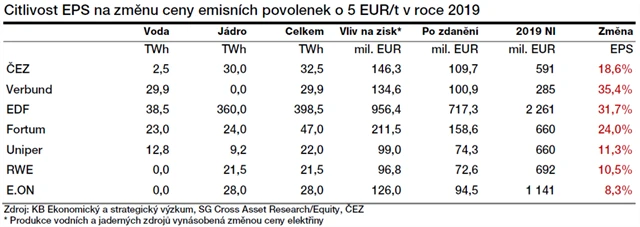 Analytik svá slova podtrhl přehledem vlivu zvýšení cen povolenek na EPS velkých evropských výrobců elektřiny na základě výroby z jaderných a vodních zdrojů a při uplatnění 25% firemního daňového zatížení. Je zřejmé, že k největším beneficientům z rostoucích cen povolenek patří výrobci se zdroji s nižšími emisemi oxidu uhličitého, jako jsou Verbund (35 %), EDF (32 %) nebo Fortum (24 %). Pozitivní vliv by však zvýšení cen povolenek mělo i na ziskovost energetických firem s vyšším podílem uhelných zdrojů, jako jsou ČEZ (19 %), Uniper (11 %), RWE (11 %) nebo E.ON (8 %).