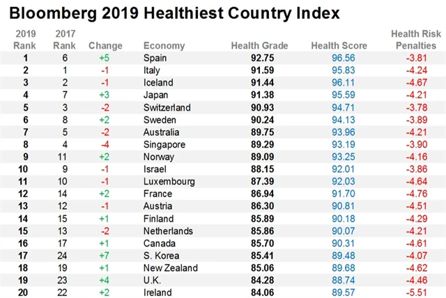 Španělsko poskočilo ze šestého místa na první, ze kterého odsunula Itálii. Na seznamu, který naznačuje korelaci mezi zdravím a bohatstvím, jsou v těsném závěsu Island, Japonsko a Švýcarsko. Bohaté země Evropy a Pacifiku žebříčku dominují, na opačném konci je 17 z 20 zemí ze subsaharské Afriky, doplňují je Jemen, Afghánistán a Haiti.